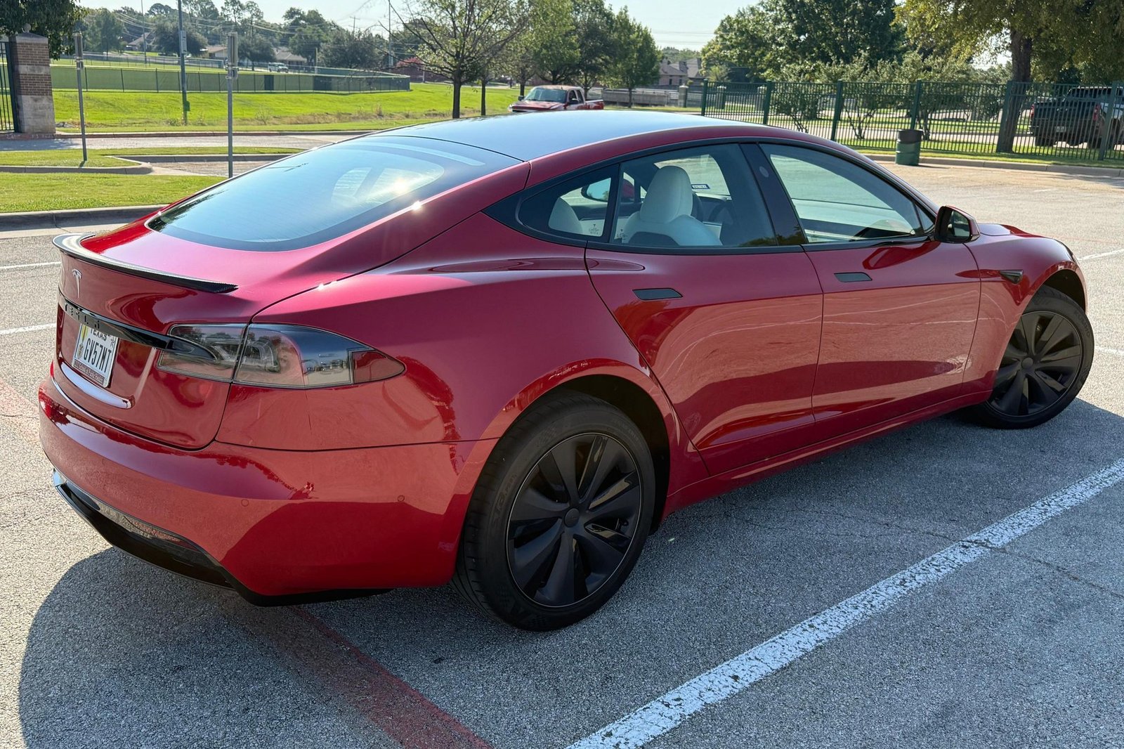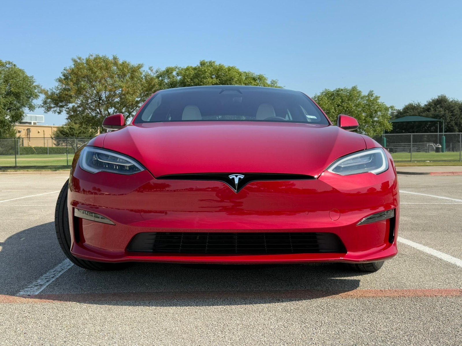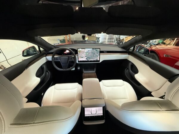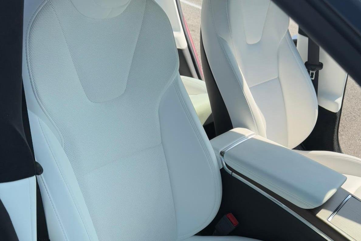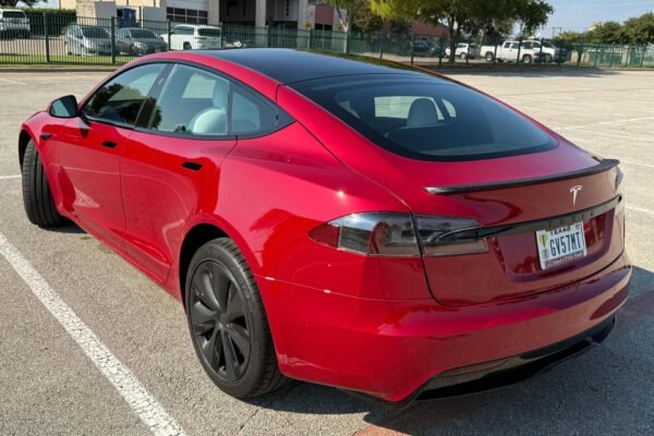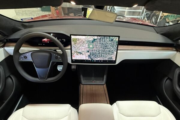 THIS… is a 2022 Tesla Model S Long Range, finished in red with a white and black interior. According to the window sticker provided in the gallery, notable factory equipment includes 19-inch wheels, a panoramic glass roof, heated and ventilated front seats, heated rear seats, and Full Self-Driving Capability. Notable modifications reported by the seller are limited to a circular Tesla steering wheel.
