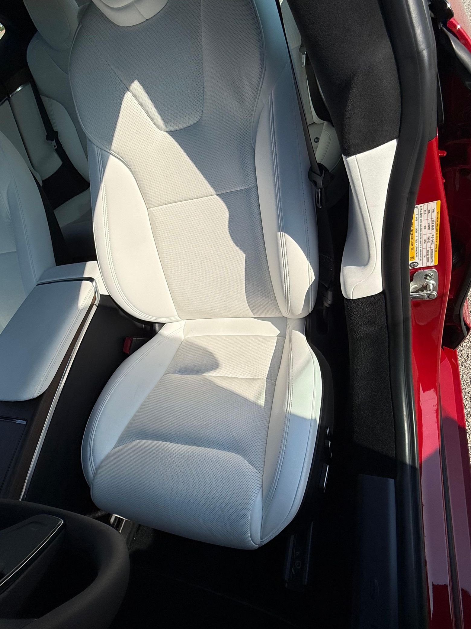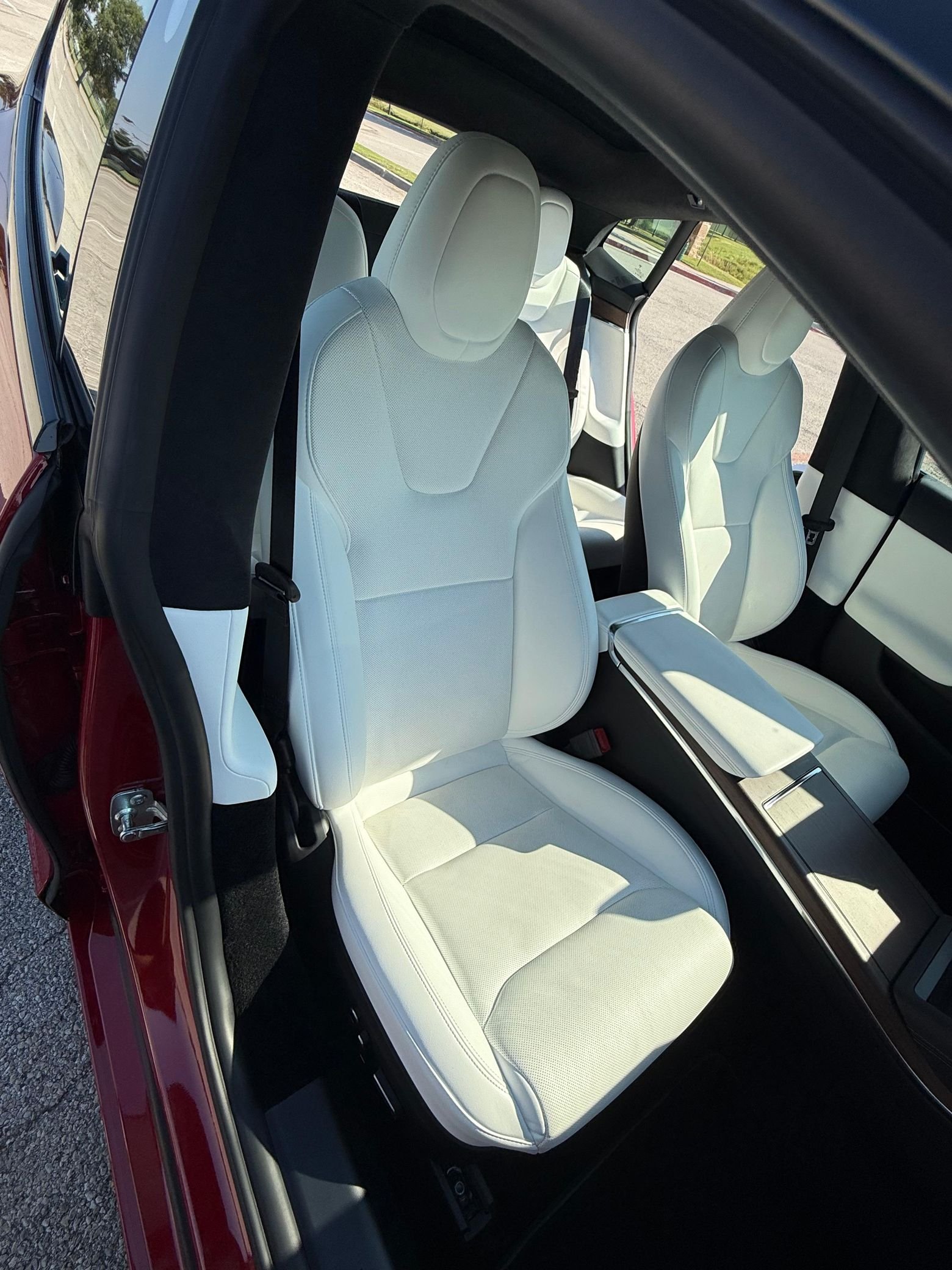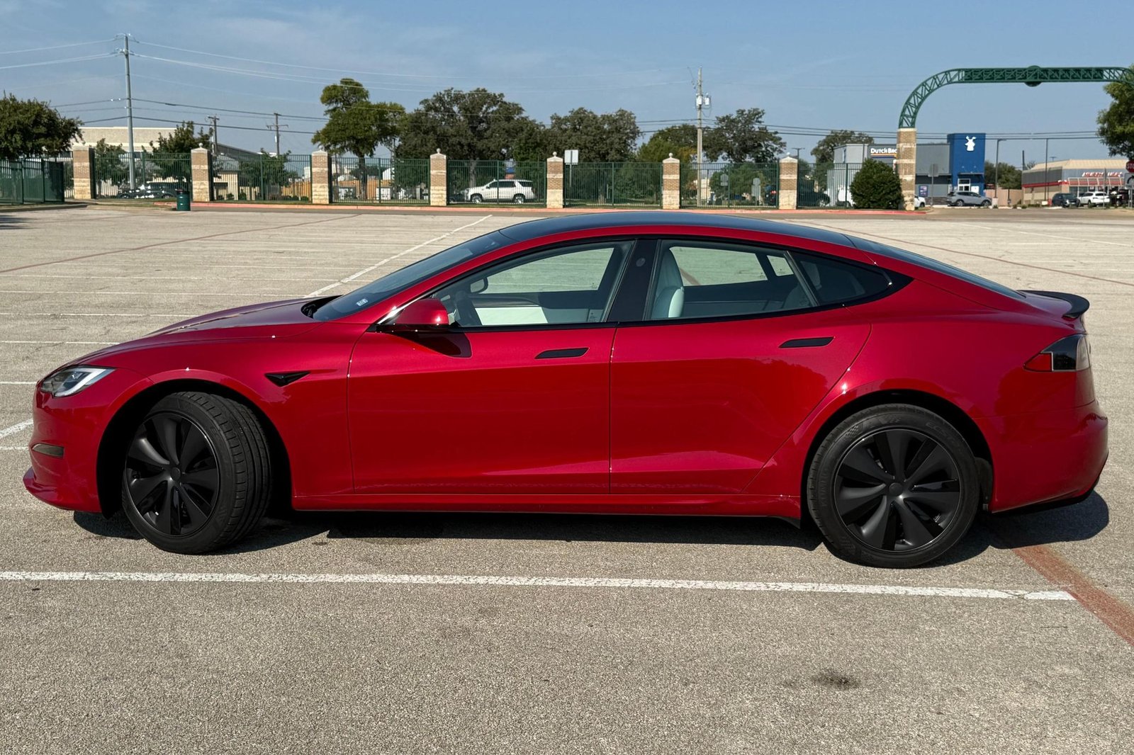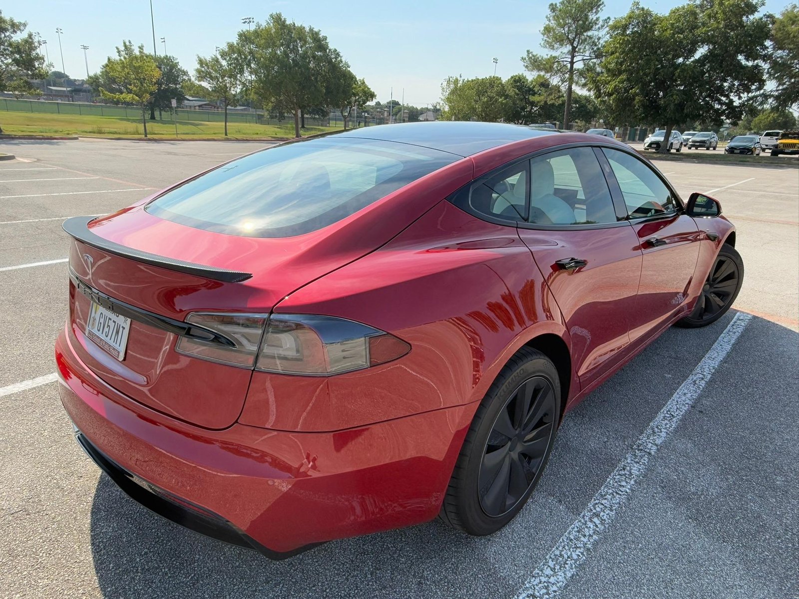 THIS… is a 2022 Tesla Model S Long Range, finished in red with a white and black interior. According to the window sticker provided in the gallery, notable factory equipment includes 19-inch wheels, a panoramic glass roof, heated and ventilated front seats, heated rear seats, and Full Self-Driving Capability. Notable modifications reported by the seller are limited to a circular Tesla steering wheel.